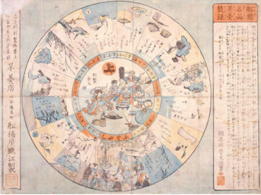 江戸時代後期、羊羹の名店・船橋屋が作った「船橋名品羊羹双録」(写真)に想を得て、アナログゲームの専門家監修のもと、とらやオリジナルの巨大な羊羹すごろくを制作。ギャラリーの床一面に広げて展示します。