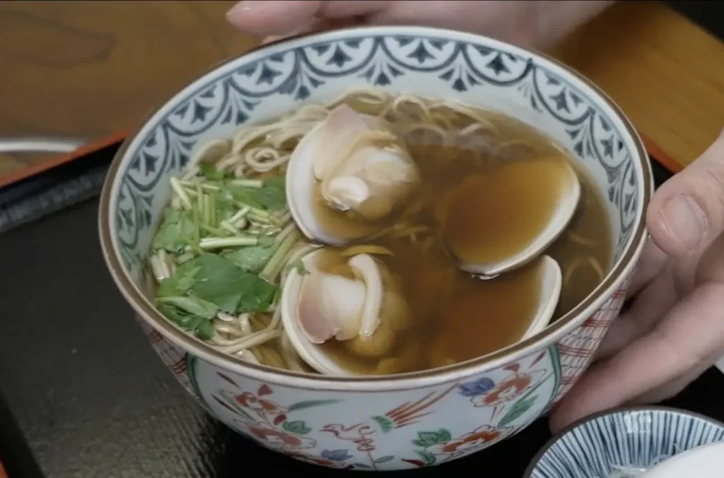 今回は、お正月からお雛様の時期に販売している縁起のいい季節ものである、「蛤そば」を頂きました。大ぶりの蛤を乗せ、出汁がよく出た人気のお蕎麦です。