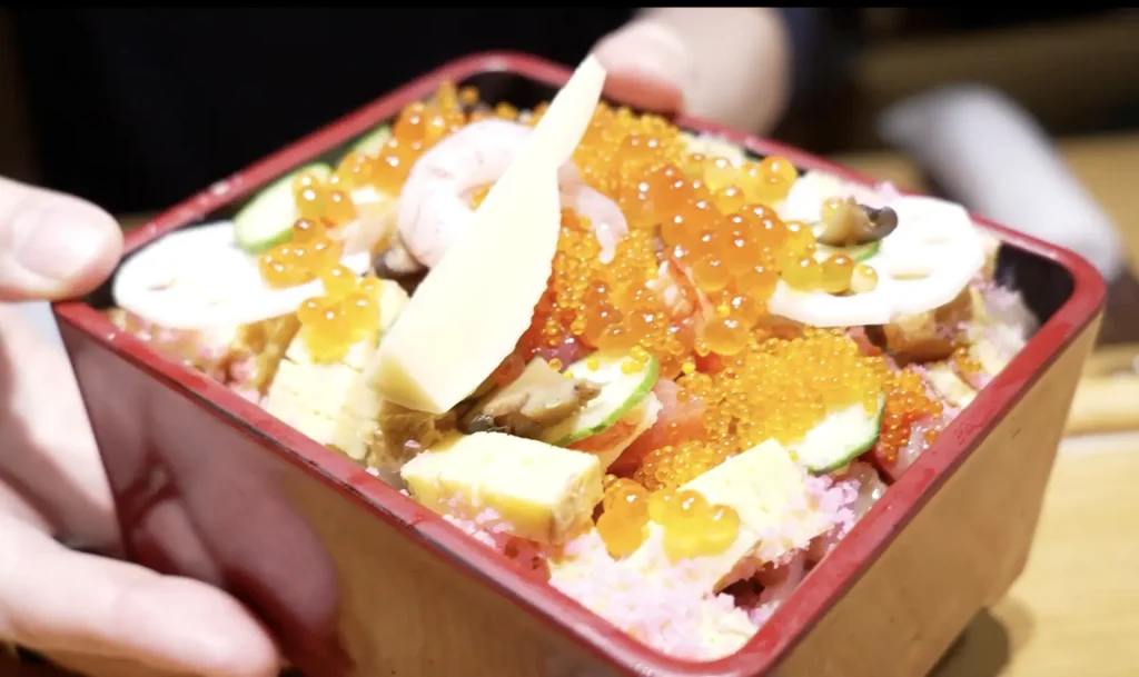 ランチにおすすめの「ばらちらし」は、いろんなお魚を細かくして作ったもの。「おかめ八目」 といい、マグロ・白身・小肌・穴子・海老と2種類の野菜・卵焼き・エビのおぼろを配して作り上げているそうです。