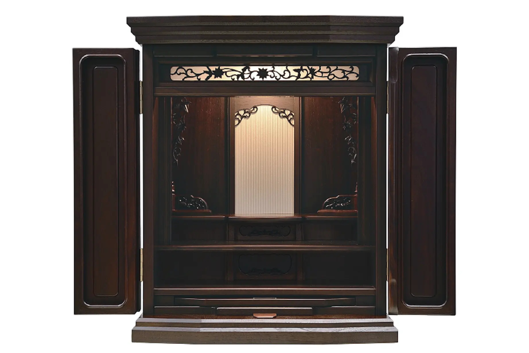 伝統的な唐木仏壇の象徴である彫刻を最小限施しながらも、都会を意識したシンプルなデザインが魅力。随所に施された繊細な彫刻で、都会型仏壇では出すことができない「荘厳さ」も醸し出しています。