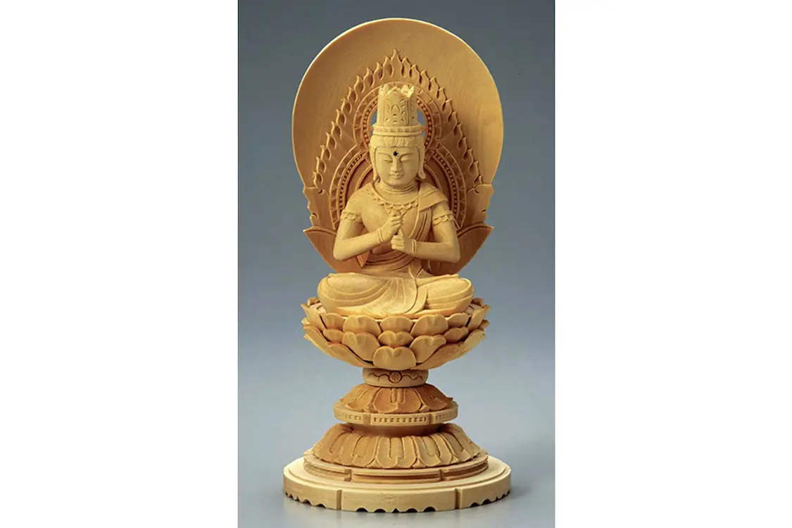 仏壇の中心に安置する御本尊。真言宗の大日如来像のほか、それぞれの宗派の御本尊を扱っています。使用する木材も、桧(ひのき)や柘植(つげ)、希少な白檀など、種類豊富に取り揃えています。写真の御本尊は3サイズ展開。