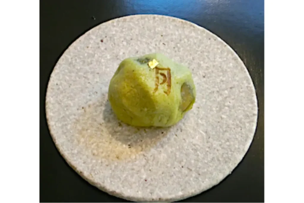 大和芋を使用したしっとりもちもちの薄皮が特徴の薯蕷饅頭(じょうよまんじゅう)。大粒の栗一粒が入り、皮には「月」の焼き印と金箔が添えられた上品な一品。