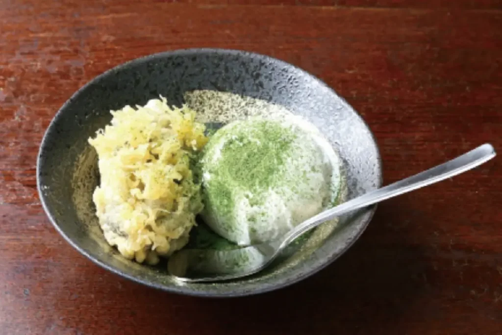 老舗天麩羅店だからこそ出せる、小倉あんこの天麩羅にアイスを添えたユニークなデザートは、ボリュームたっぷりの天丼を食べた後でもペロリと行けてしまうほど美味。
