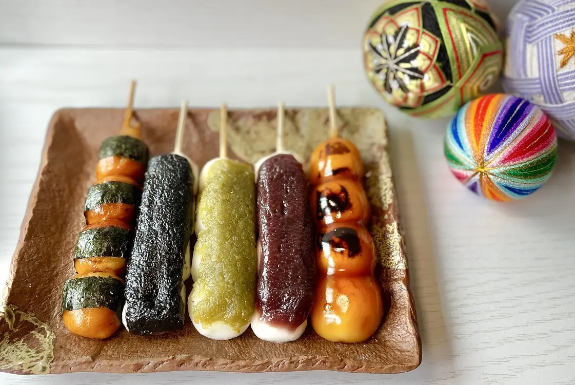 大粒でもちもちのお団子に甘じょっぱいみたらしがたっぷりとかかった、創業以来不動の人気を誇る看板商品。
