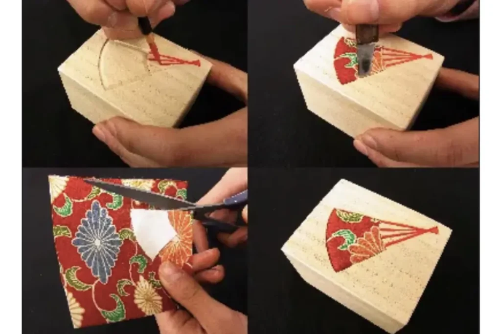 毎月1回実施される「桐木目込み細工体験・教室」では、あらかじめ彫りの工程を済ませた桐を使って、自身で着物地を選び木目込みを体験することができます。初回はプチ福箱(小さい桐箱)を、難易度の低い「扇・瓢箪・桜」の柄で3個制作。初心者でも丁寧に教えてくれるので安心して参加することができます。