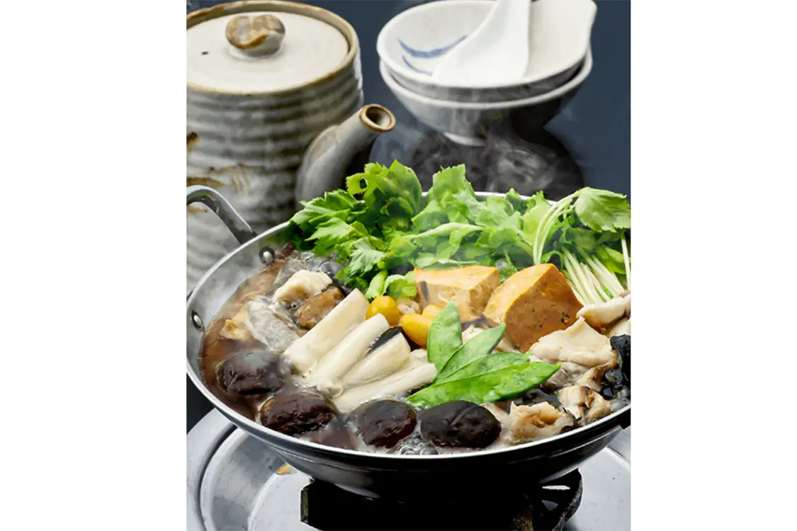 身やあん肝の他、皮やひれ、卵巣やエラなど、丁寧に下ごしらえされたあんこうを余すことなく堪能できる鍋。秘伝の醤油だしにより、淡白でクセのないあんこうの奥深い味を楽しめます。ウドやミツバなどあんこうと相性の良い野菜もたっぷり。あんこう鍋を含む、あんこうづくしのコース料理も複数用意されています。