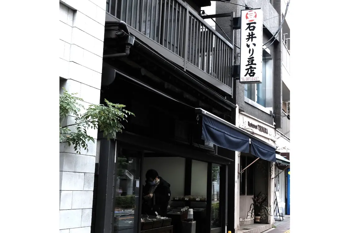白山通り西片交差点近くに建つ明治20年(1887年)創業の煎り豆店。現在は5代目ご当主の石井雄貴氏夫妻と、先代である4代目ご夫妻の4人で店を営んでいます。店内に入り、まず目を引くのは、振り網と呼ばれる大きな豆煎り機。落花生や大豆などは店内で煎り上げているため、煎り時間に店を訪れると芳ばしい香りを感じることができます。こだわりは豆の種類や、その日の気候、湿度によって煎り時間を細かく調整していること。落花生は15~20分、煎大豆は1日水に浸した後、1時間30分ほど煎るそうです。初代から受け継がれてきた伝統であり、豆本来の風味を引き出すために欠かせない工程なのだとか。