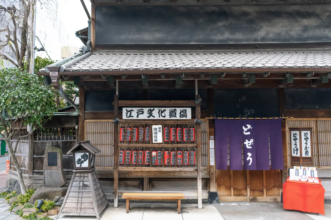 日光街道へとつながる江戸通り沿いに建つ見事な店構えは、江戸時代の代表的な商家造り。傍に植えられた柳にも江戸の風情が溢れている、ここが「駒形どぜう」です。戦後、江戸時代の図面を元に建て直したという「出し桁造り」は、思わずスマホのシャッターを切りたくなるような美しさ。江戸時代は目の前を参勤交代の行列が通ったため、大名行列を見下ろす無礼を避けるために通りに面した2階には窓がありません。