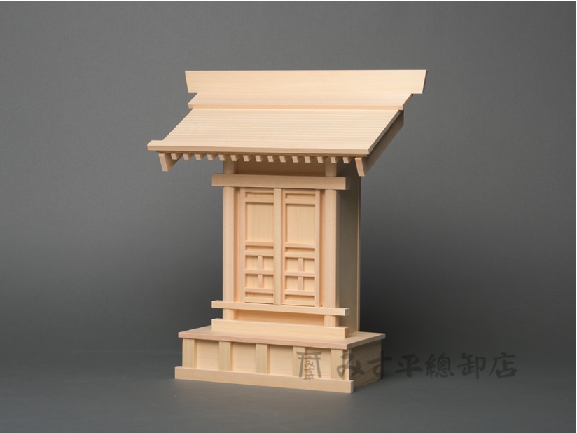木曽檜(尾州檜)造りの唐戸(からと)という扉のデザインを採用した標準的な一社宮です。階段も手摺も付かないシンプルなタイプです。扉は開け閉めが出来、扉全体を手前に引くと扉を外すことも出来る仕様で、お札を納める際に便利な造りになっています。