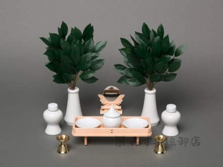 神棚をお祀りする際に必要な神具一式で、必要最低限の神具が揃っています。セットの内容は、水を入れる水玉(1個)、塩や米を入れる皿(2枚)とそれらを置く長膳、榊を入れておく榊立て(1対)、御神酒を入れておく瓶子(1対)、蝋燭立て(1対)と神鏡(1個)となっています。