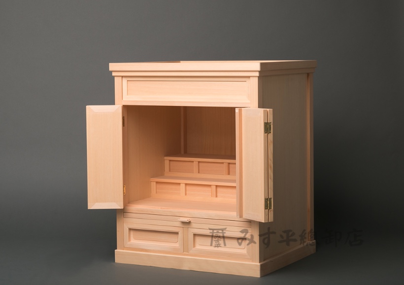 伝統的な一枚板から作られた祖霊舎(ご先祖様を祀る場所。仏教における仏壇)です。扉に使用する一枚板は、上下に一部45°の切り込みを入れ、反り止となる桧の桟を美しく取り付けるハシバメ工法で仕上げた最高級品。お供え用の引き出しや収納スペースも付いており、使いやすい造りとなっています。