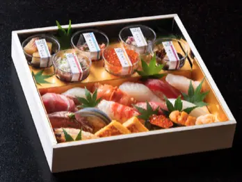 松乃鮨自慢の江戸前の握り13貫ほどとおつまみが6種入った寿司折りです。店舗でいただくのと同様、新鮮なネタで丁寧に握られた握りや選りすぐりのおつまみを楽しめます。予約制のテイクアウト専用ですが、事前に予約をしておけば1人前から対応してくれます。