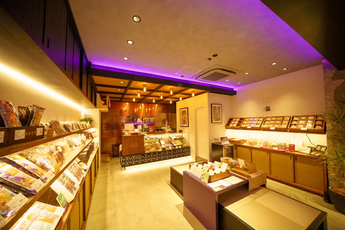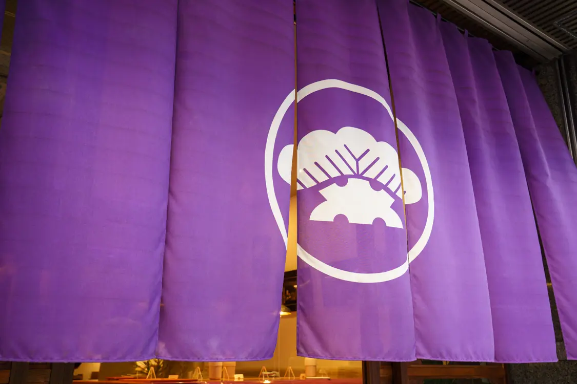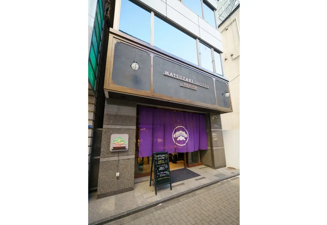 銀座の顔ともいえる歌舞伎座のすぐ近くに新しく本店を構えた「MATSUZAKI SHOTEN (銀座 松崎煎餅 本店)」。松の紋をくっきり染め抜いた濃紫の大暖簾が遠くからも目をひきます。暖簾をくぐって店に入れば、真っ先に目に入るイートイン用の大テーブルのせいでしょうか、広々と洗練された空間にもかかわらず、どこかくつろげる雰囲気。壁に据え付けられた棚と中央の平台には、さまざまな煎餅が品良く並べられており、品選びもしやすいゆったりとした売り場です。