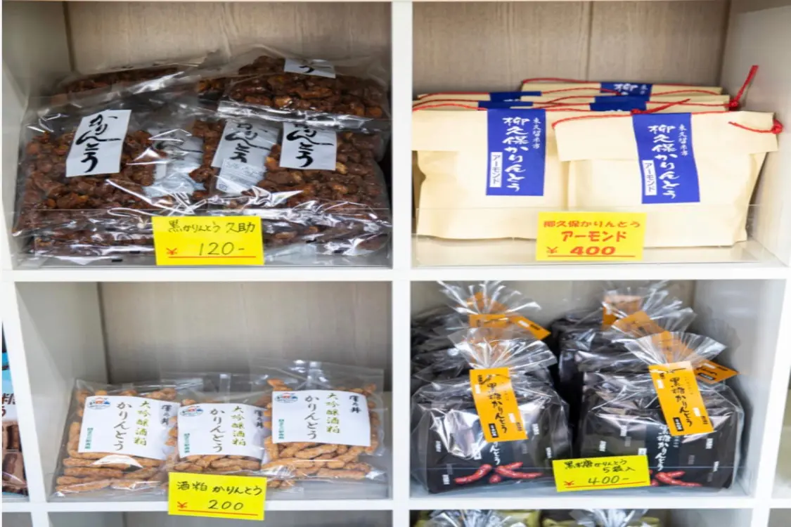 工場敷地内にある直営所では、かりんとう以外にもおかきや、不揃いなアウトレット品などをお得に販売しています。