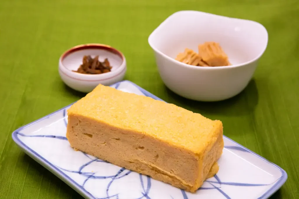 弁松の代表的なおかずの中から3つをご紹介。まずは出汁をたっぷり使い、しっとりと焼き上げられた「玉子焼」。「つとぶ」は、もっちりぷるんとした生麩をすだれ(つと)で巻き、甘く煮たもの。最後は辛味とうまみを醤油でまとめたキリッとした味で、弁当全体をぐっと引き締める「生姜と昆布の辛煮」。弁松の味のバランスを感じられる3品です。