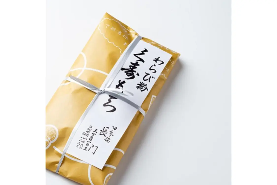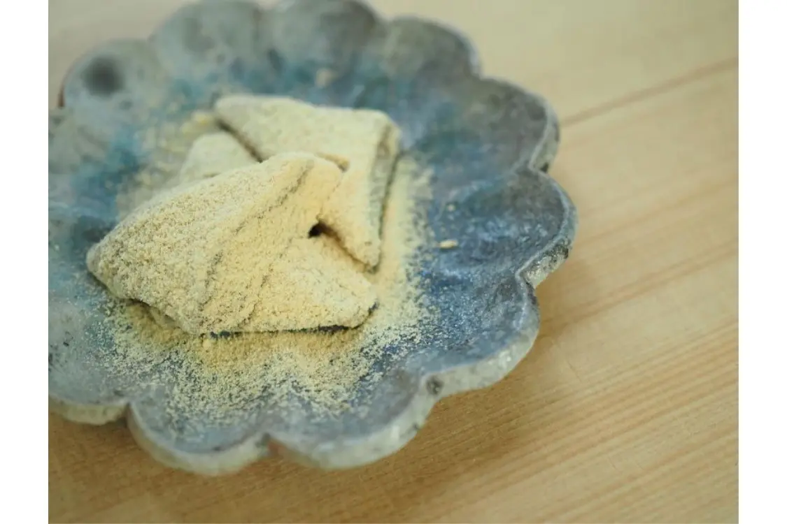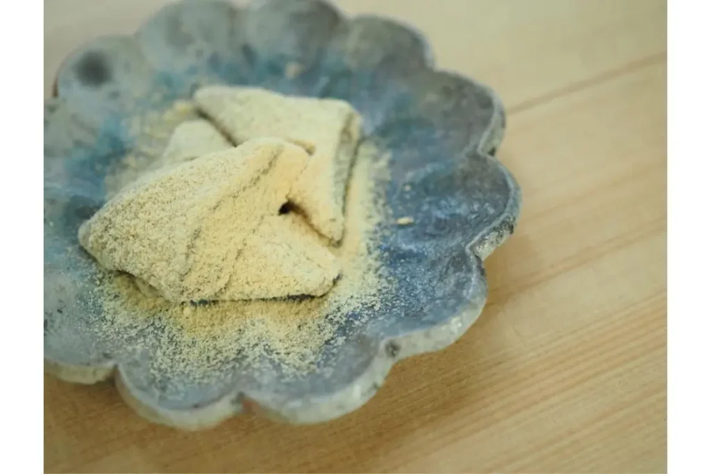 名前は「久壽(くず)もち」ですが、その正体は関西で言う「わらび餅」。材料は本わらび粉と砂糖のみ、上品な甘みとぷるぷるの食感はやみつきになる美味しさ。2種類をブレンドしたきな粉が味の深みを引き立てます。15分ほど冷蔵庫で冷やすのがおすすめ。