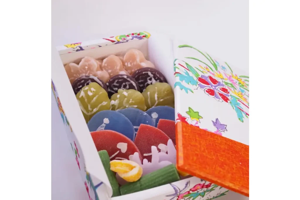 季節に合った柄の千代紙を貼り付けた木箱に、数種類の半生菓子が並ぶ様子が彩り鮮やか。贈答用に買い求める人が多く、海外へのお土産としても人気です。食べた後の箱は、小物入れとしても利用できます。※内容は季節によって替わります。