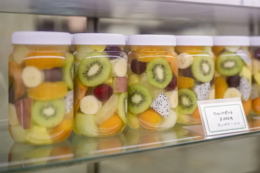 フレッシュな季節のフルーツ12~15種類がシロップにつけこまれています。最後の一滴まで飲み干せるスッキリした甘さのシロップも人気の秘密。手土産としても人気です。
