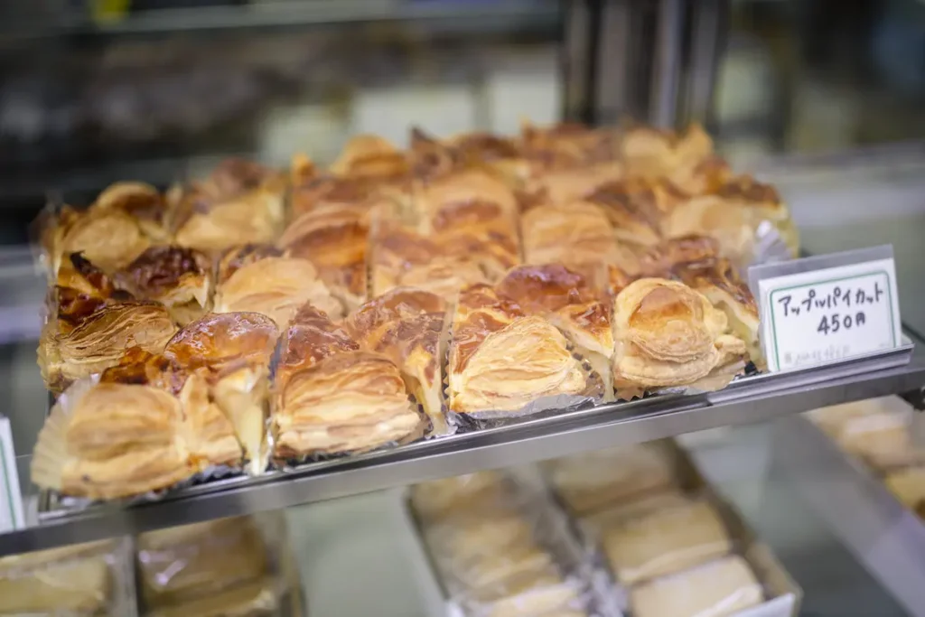 りんごは酸味・甘味・香り・歯ごたえすべてにおいてバランス抜群の「ふじ」を、時期によっては「つがる」を使用。パイの部分には水分の少ないバターと選りすぐりの小麦粉、卵黄を丁寧に折り、外はサクサク、中はジューシーです。