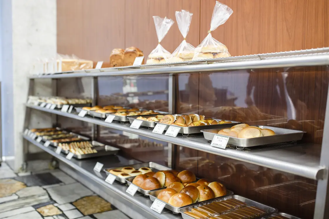 昭和41年(1966年)に建て替えられたというビルは、現在も昭和の面影を残したレトロモダンな雰囲気で訪れる人を迎えてくれます。入り口を入ると、右側にケーキや焼き菓子などが並ぶショーケース、左側にパンのコーナー。近江屋洋菓子店は、もともとパン店から始まったという歴史があり、現在もパンは平日なら20〜30もの種類が並びます。パンもすべて自社で製造しており、クリームパンのカスタードクリームやあんぱんの餡も自家製なんです。