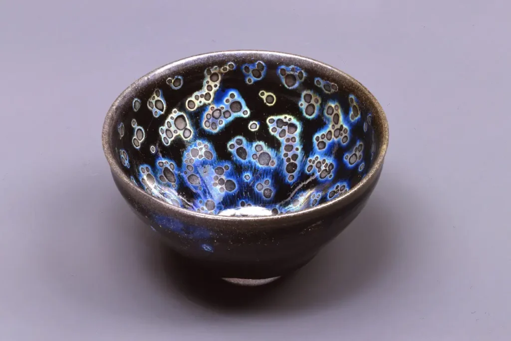 曜変天目は建窯の黒釉茶碗で斑紋の周囲に青色を主とする光彩があらわれたもの。完全な形で現存するものは、国内に伝存する3点のみ。所蔵品は光彩が見込み全体に鮮やかにあらわれた一碗。