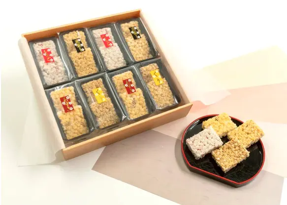 もち米を使用した種と水飴、卵白、あんこを混ぜた半生タイプのおこしです。今までにない柔らかい食感で、独特の弾力もある新スイーツです。定番の白みつあずきと黒みつきなこの他、季節限定の味が2種類入った詰め合わせです。どの味も優しい甘さで食べやすいのが魅力の商品となっています。