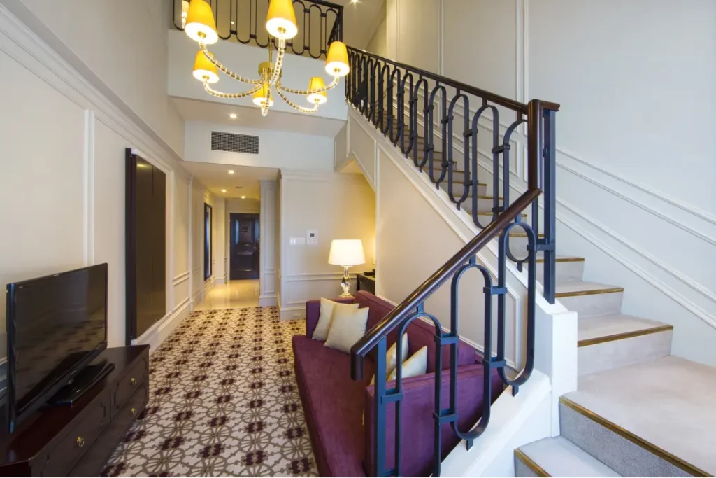 1階のリビングルーム、2階の寝室に分かれたユニークなメゾネットタイプの客室。天井高がある東京ステーションホテルだからこそ提供できる空間でゆっくりとくつろげます。