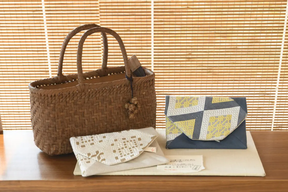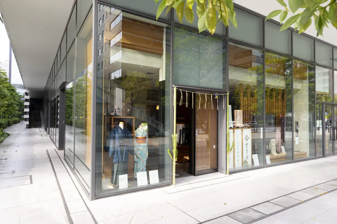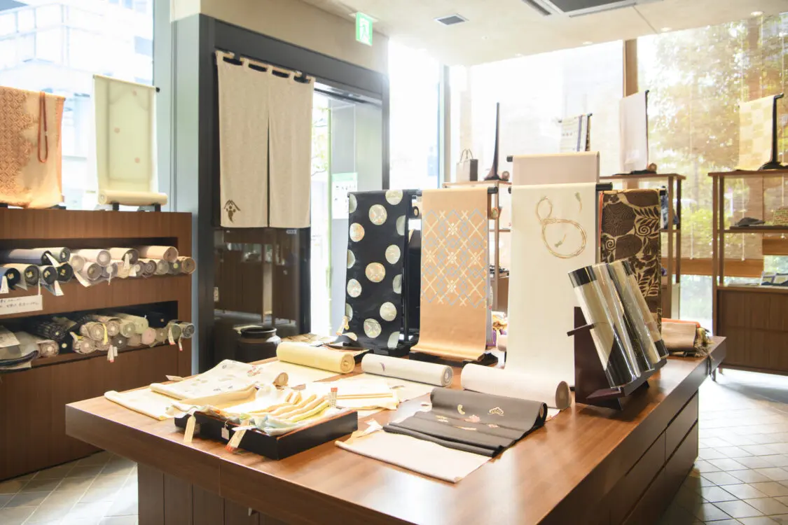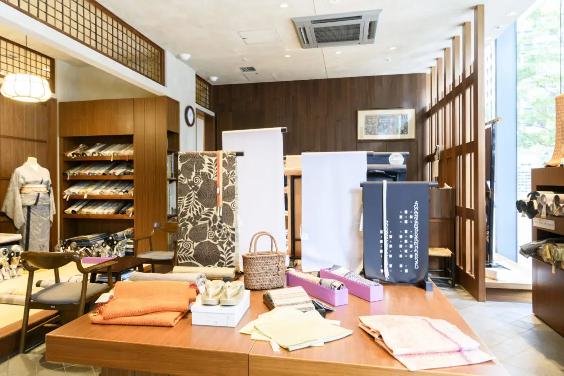 このビルが建つよりもはるか昔から、この場所で商いを続けてきたお店であることを物語るかのように、ビルのエントランスとは別の、通りに面した独立した入り口から店内へ。洋装と和装どちらでも使える上質な小物とともに、お店の名を冠したオリジナルの紬や帯、オノ・ヨーコ氏ゆかりの和装用つぼ折れコートといったストーリーある商品が並びます。店主が畳に座り、反物を広げながら装いの相談をする昔ながらの座売りスペースでは、和の商いの場を感じることができます。